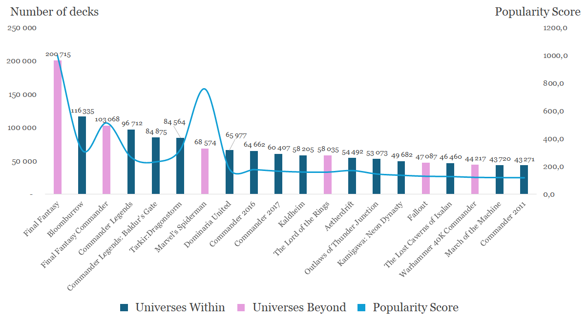 First, the number of Universes Beyond commanders. Wizards of the Coast's new policy in this matter has certainly helped boost the numbers, especially since several of them seem rather pushed, in terms of power level. However, I'm rather surprised that this trend seems to dwindle as you go deeper in the rabbit hole.