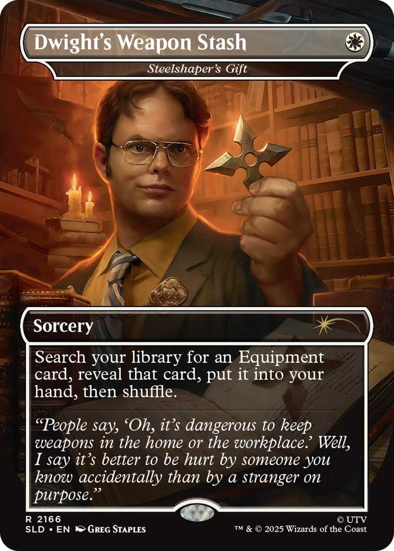 This drop features the character Dwight Schrute, from the American TV show The Office. It shows Dwight as a reskin of several Magic cards, including legendary creatures Heliod, Sun-CrownedHeliod, Sun-Crowned and Baral, Chief of ComplianceBaral, Chief of Compliance, as well as a planeswalker card, Garruk RelentlessGarruk Relentless.