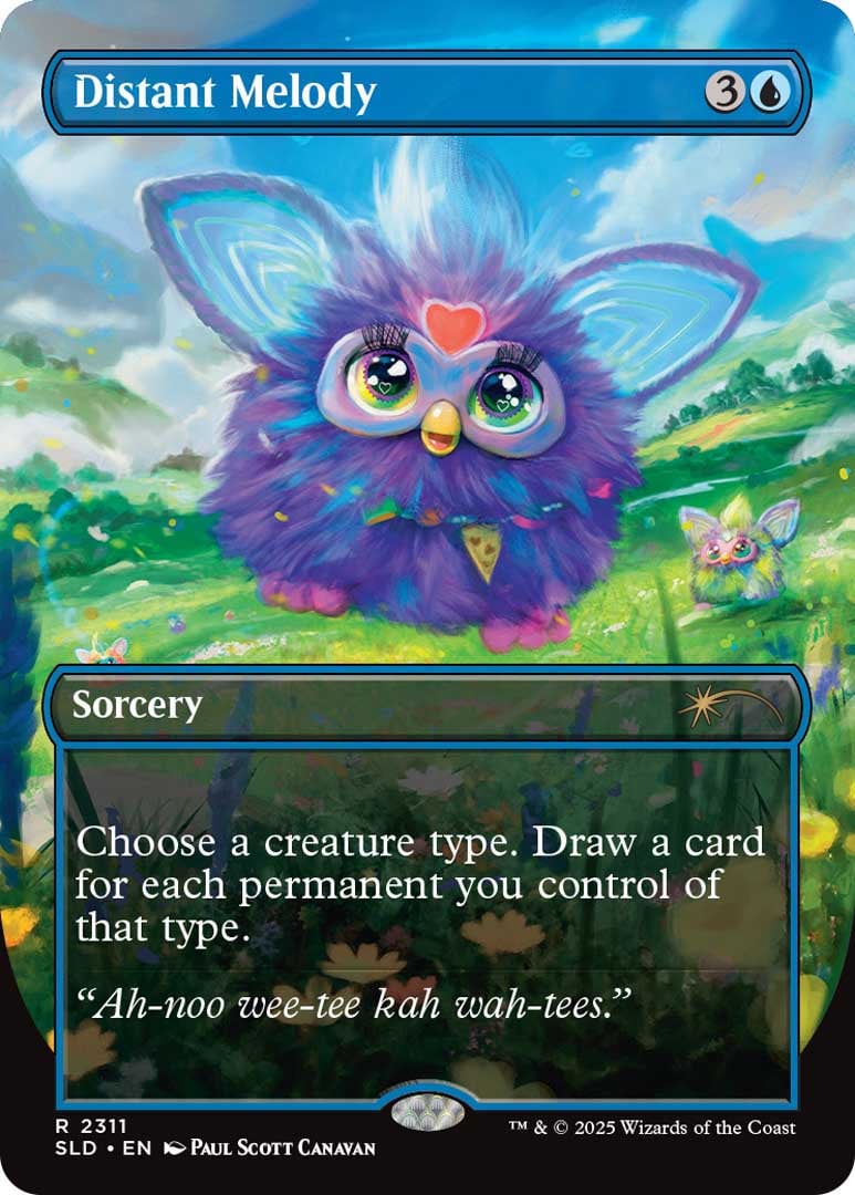 The second drop is Secret Lair x Furby: The Gathering. This drop puts the furbies "in-universe" as they interact with Magic characters like Aurelia and Tamiyo.