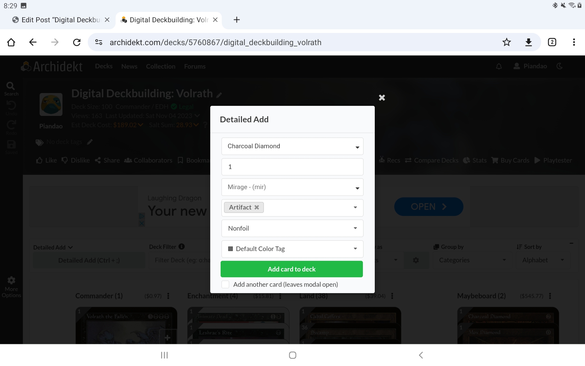 That means you can open separate windows for your deck page and any page on EDHREC, then drag and drop cards. No typing required.