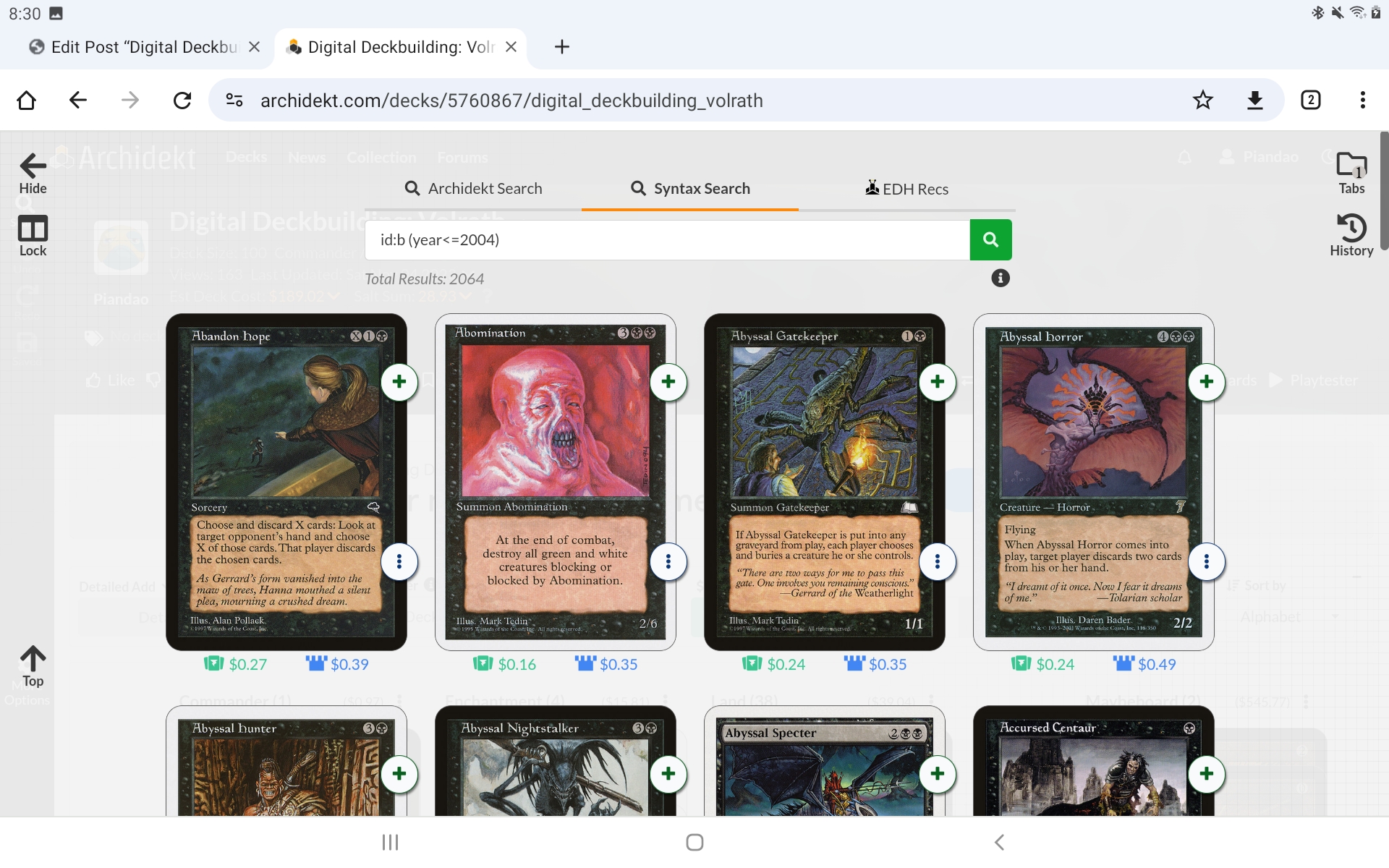 Archidekt pulls data from Scryfall and uses the same search syntax. Volrath's color identity is mono black, and as I said earlier, I wanted to limit this deck to cards that existed at the time I was a teenager.