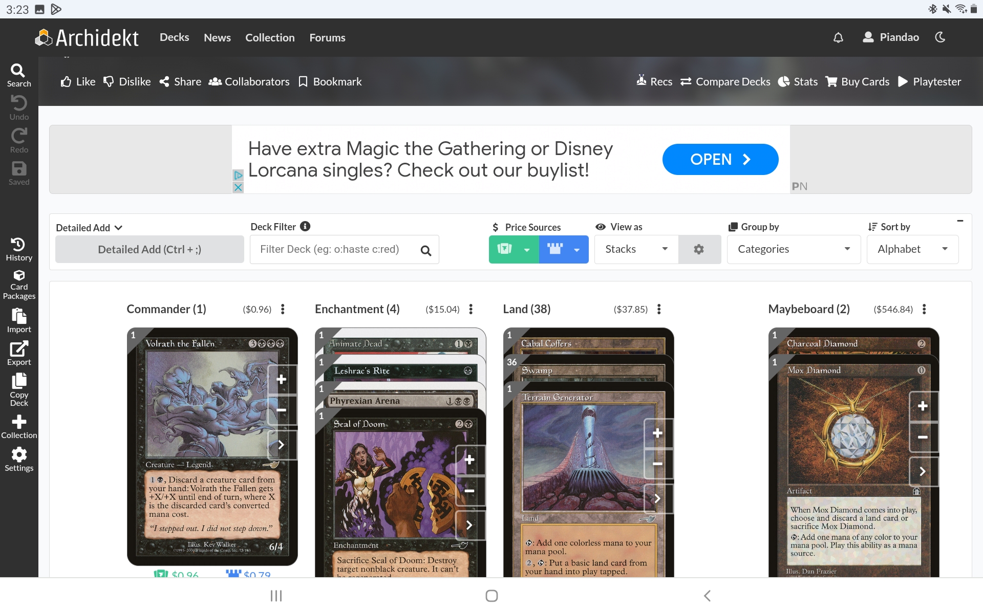 Having achieved a healthy degree of catharsis, I got back to deckbuilding. I thought this deck might need more ramp, so I used the deck page search bar to add some things to the Maybeboard.