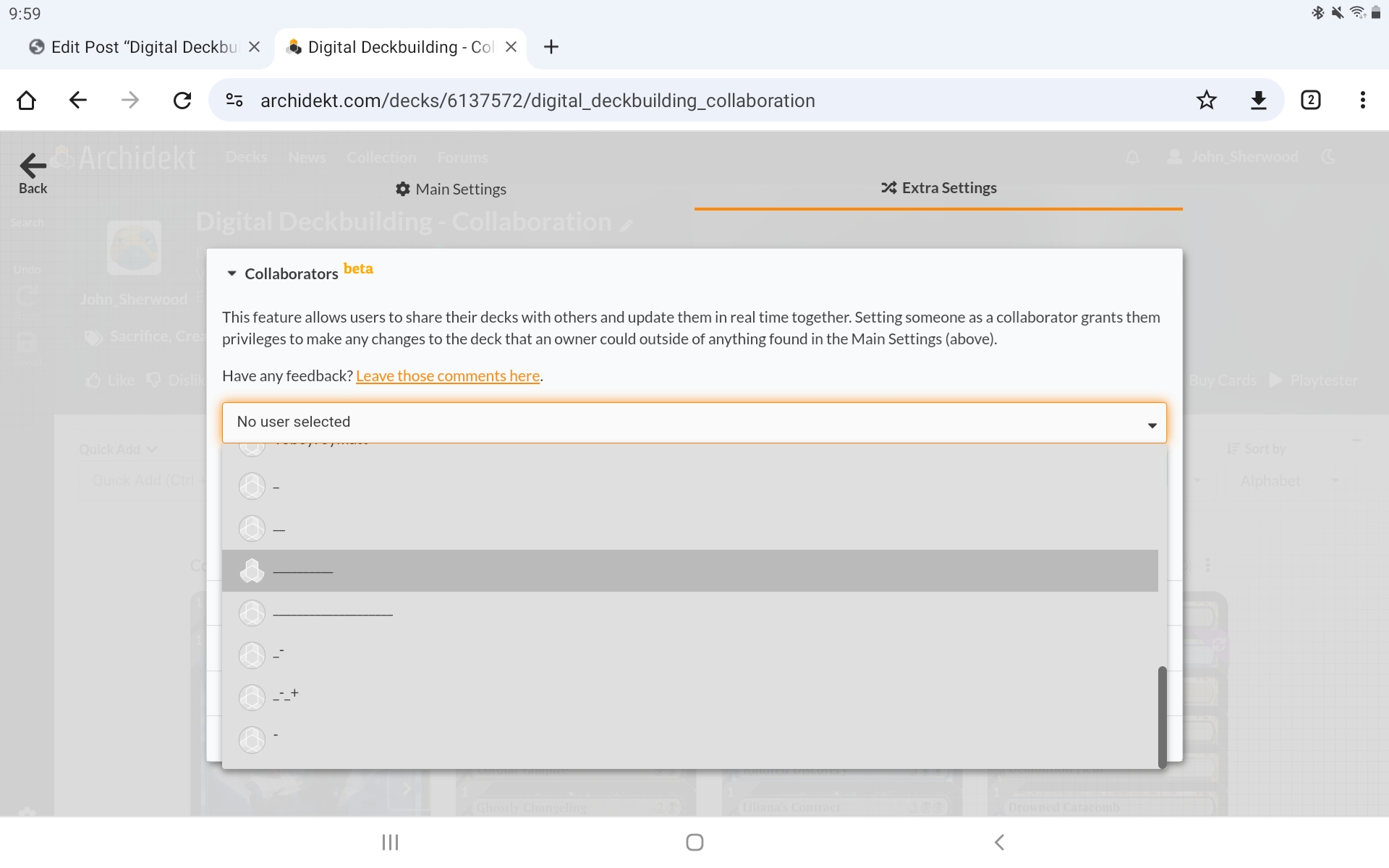 In other words, you can add any other Archidekt user as a collaborator. Be courteous and don't try to add someone as a Collaborator unless they already agreed to it. Just because you can add any user, doesn't mean you should. Even though it is still your deck, you are giving another user the ability to make any changes they want to cards, tags and categories. So don't add anyone you don't trust to make decisions for the deck's contents.