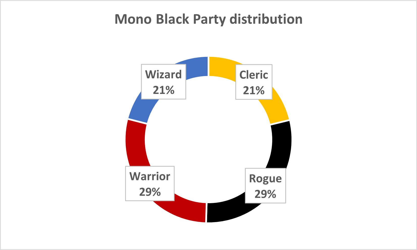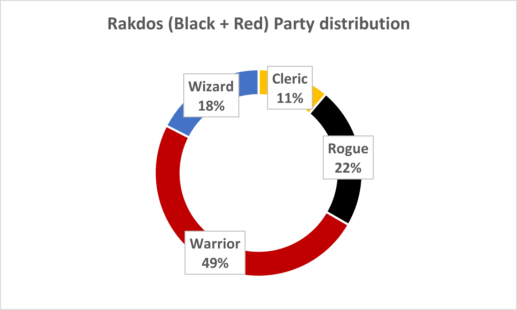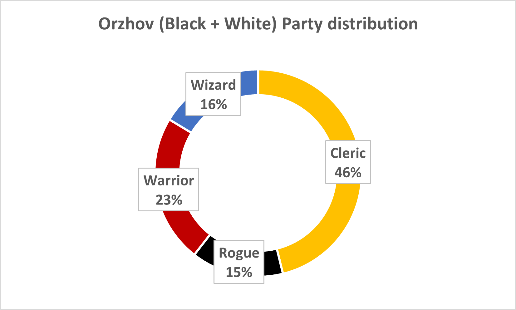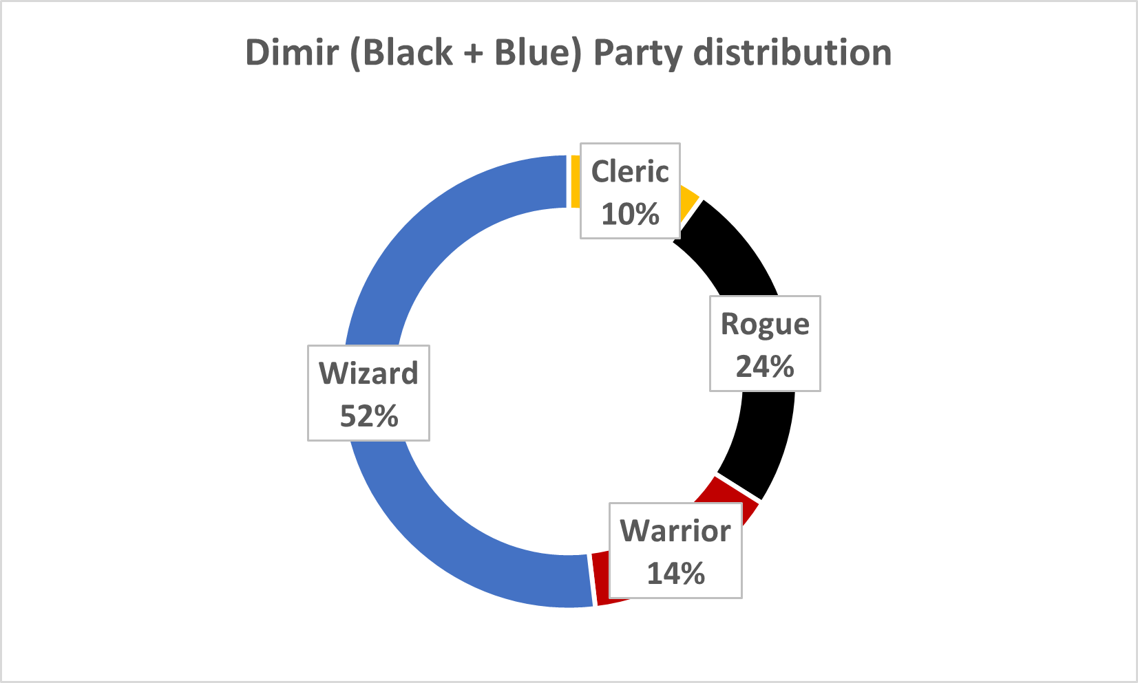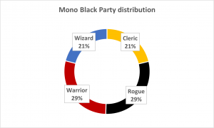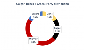 - What is the breakdown of the differing types of party creatures (Clerics, Rogues, Warriors, and Wizards) by color identity?