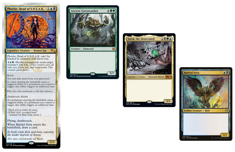 With no unifying keyword or mechanic to tether our remaining cards, I'm just going to lump some of the notable ones into a visual table. Our table of hyper-niche evasive cards can be broadly categorized as follows: