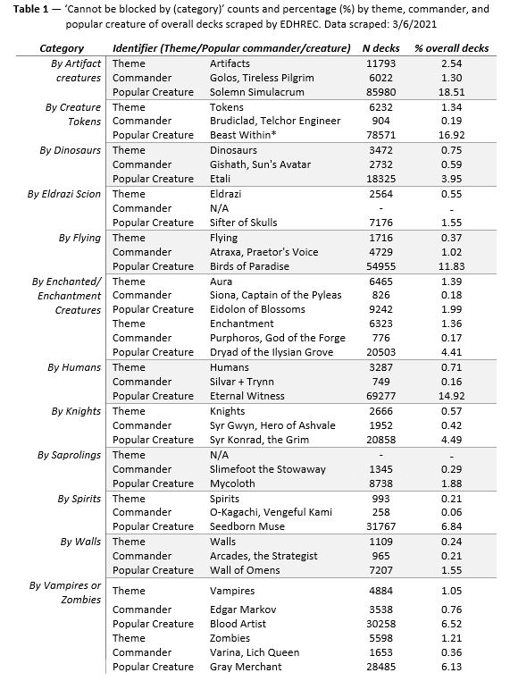 So how likely is such a mismatch to occur? Well, one way we can tackle it is by looking at each of the specified creature's evasive potential above against the number of decks and subsequent representation (percentage, %) of overall decks scraped by EDHREC. I'll do a crude approximation, analyzing the: