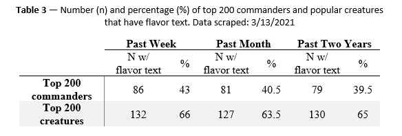 - The number and percentage of Artifact-themed decks (11,793, 2.54% of all decks scraped), since they are likely to contain artifact creatures;
