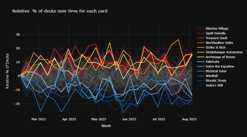 Most of the hot cards for this deck actually have to do with artifact tokens! Spell SwindleSpell Swindle is already one of the most popular cards for Galazeth pilots, and it's got a Fire Score of 2.40 here. This spell, like Unexpected WindfallUnexpected Windfall before it, spans the gap between spellslinging and artifact synergies beautifully. Its popularity is anything but unexpected. Same goes for Strike It RichStrike It Rich (and its Fire Score of 2.17). This sorcery is functionally a TreasureTreasure token on a spell. It can even be recast from the graveyard later, if we're desperate for game actions to take.