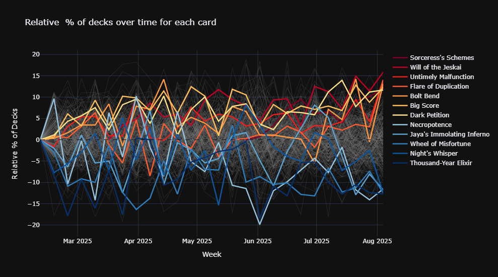 We've got a trio of redirect spells up next. Flare of DuplicationFlare of Duplication's got a Fire Score of 2.43, Untimely MalfunctionUntimely Malfunction's got a Fire Score of 2.45, and Bolt BendBolt Bend's got a Fire Score of 2.28.