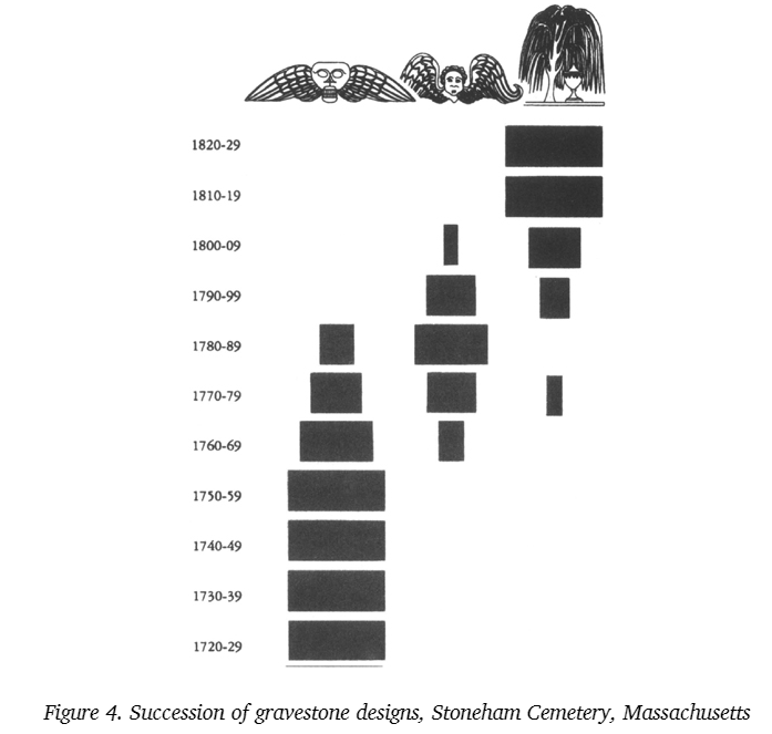 Unlike your traditional temporal graph, which often puts 'time' on the X-axis, these 'battleship graphs' (so named for the shapes they often produce) tend to invert 'time' to the Y-axis, and use the width of each bar to represent popularity. The graph shows that over time (moving from bottom to top), the 'death's head' (skull with wings, left-most column) was beginning to diminish in the latter half of the 18th century, just as the 'cherub' (baby-face with wings, middle column) increased in popularity. The cherub replaced the death's head, but its own popularity was short-lived, lasting only some 50 years. It was eventually replaced by the 'urn and willow' design (right-most column), which replaced the winged heads altogether, and continued to be the preferred style into the 19th century.