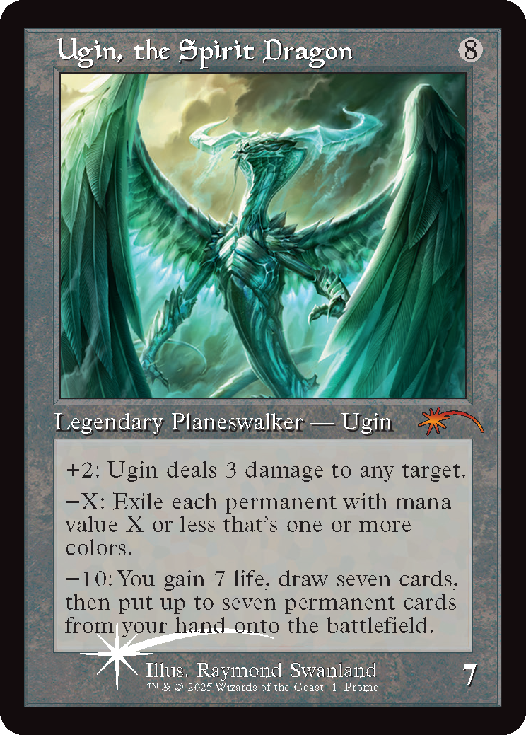 A retro-frame copy of Ugin, the Spirit Dragon, an exclusive for MagicCon Las Vegas's Festival In A Box. Image credits: Wizards of the Coast