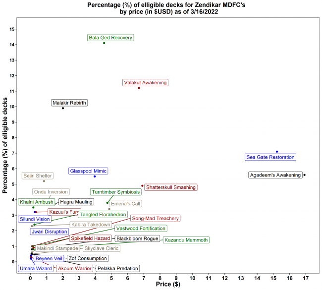 While the vast majority (20 out of 30; 66.7%) of MDFCs cost less than $1, there are a few outliers in Sea Gate RestorationSea Gate Restoration and Agadeem's AwakeningAgadeem's Awakening, which isn't entirely surprising, considering these two are mythics, and some of the better of the mythics suited for EDH, whereas Shatterskull SmashingShatterskull Smashing, Turntimber SymbiosisTurntimber Symbiosis, and Emeria's CallEmeria's Call all fall a bit lower in both price and popularity.