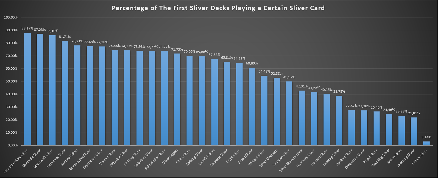 While it's pretty difficult to enter into much detail about this graph, one thing stands out: 2/3 of the Slivers included see play in 50% or more of The First SliverThe First Sliver decks, with only Frenzy SliverFrenzy Sliver being included in a nearly-irrelevant number of decks. All the options between Sliver GravemotherSliver Gravemother and Leeching SliverLeeching Sliver are perfectly viable and played, they're just a step behind the enormous core of creatures present in these typal decks.