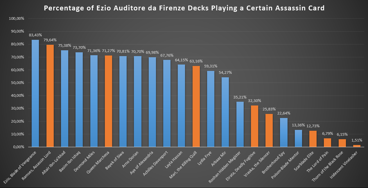 Ezio Auditore da FirenzeEzio Auditore da Firenze is the most played Assassin commander, being at the helm of 7479 decks according to EDHREC. Let's take a look at how the Assassins we play do in dedicated lists.