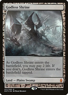 Godless ShrineGodless Shrine is but one of ten of the cycle of "Shock Lands" that have been popular in the format since its inception, despite their price tag always being in the $15-20 range. The reason for their popularity? Why, they're the next best thing to the original Dual lands, of course! They can come down untapped to give you access to two different colors of mana, or you can even search them up with anything that looks for a basic land type! The high popularity of this perpetually $10+ card compels me to remind everyone that you don't need to have $500 mana bases with shocks and fetches, and that budget mana bases are still very, very good.
