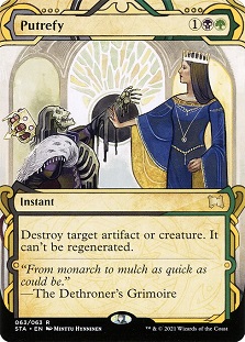 I, for one, was not expecting for the spooky scary skeletons list to devolve into Apocalypse staples from back in the day, but here we are. PutrefyPutrefy was the ultimate in flexible creature removal, or at least it would have been if it wasn't printed right alongside VindicateVindicate. Regardless, it allowed Golgari decks to choose between a problem creature or a problem artifact, even before Golgari existed as a concept. While there have been attempts to outclass it with Assassin's TrophyAssassin's Trophy, Abrupt DecayAbrupt Decay, and the like over the interceding years, it's still the no-nonsense version of this effect in green and black in the same way as TerminateTerminate, at least until Wizards decides otherwise.