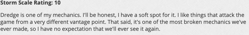If you don't believe me about Dredge being absolutely busted, don't just take my word for it. This quote is from an article series that Mark Rosewater does called the 'Storm Scale', which you can find here. It's pretty interesting stuff.