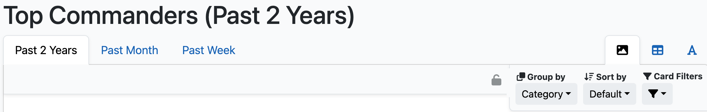 The default view of Top Cards displays data for the last two years, in thumbnail view without grouping, sorting or filtering. This is just the tip of the data iceberg. Here, as on other EDHREC pages, there's a lot more to see beneath the surface.