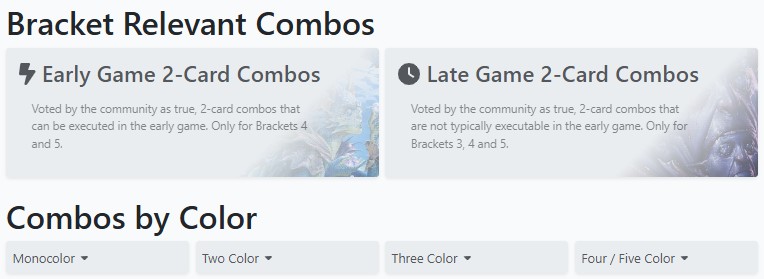 The combo menu  provides links to view combos by color identity or recommended bracket.