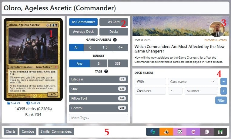 • Box 5 shows charts, combos and similar commanders, as well as links to other helpful Magic sites.