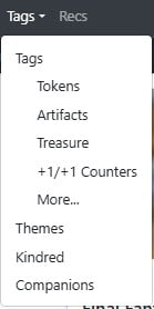 The main Tags page is wide-cast net for every imaginable deck archetype. Meanwhile the Theme and Kindred tabs divide the tags into two main groups: Themes are tags focused on mechanical cohesion, and Kindreds are tags focused on specific creature types.