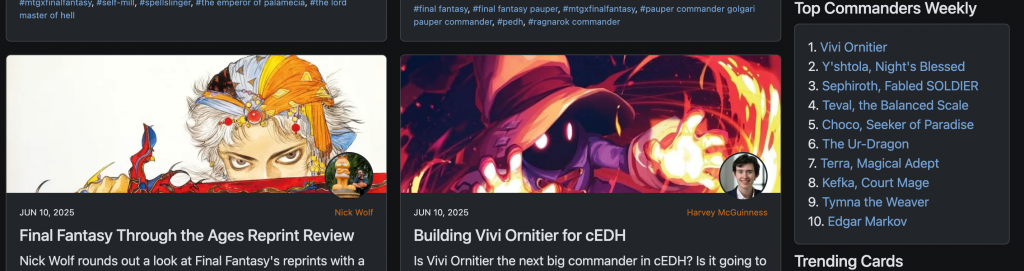 The EDHREC home page features a list of the most popular commanders other players built in the last week. This list may change rapidly during spoilers for a new set, and it tends to be fairly stable between set releases. The home page also spotlights one lucky Commander of the Day.