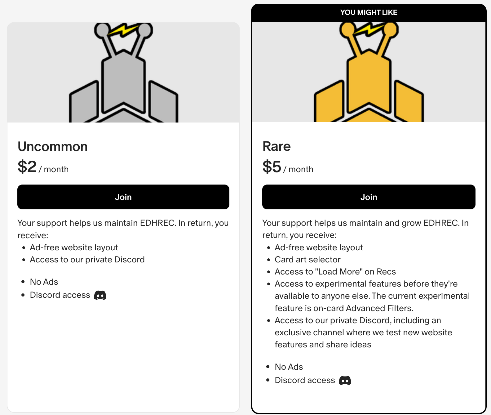EDHREC's Patreon is a great way to support the development of the site and get access to some advanced features for Patrons only.